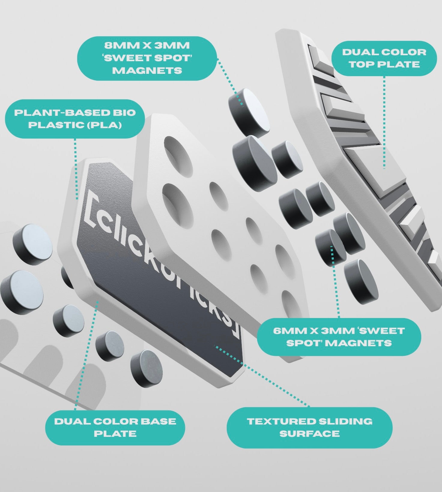 Clickbricks are free floating magnetic fidget sliders — two precision-printed halves with embedded magnets that let you click, slide, flip, and fiddle with. They're satisfying, pocket-sized, and built for brains that need taming.